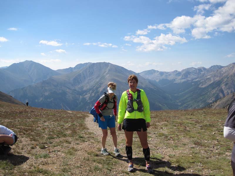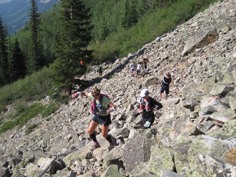 IMG_3778Day 2 – Vicksburg to Twin Lakes (via Hope Pass): 13.3 miles/3250ft elev. gain. The bus ride to the start took about 30 minutes–enough time to build up nerves of anticipation. I was going to crest the famous Hope Pass. It sits at 12,600ft and is challenged twice in the Leadville 100 race. Thankfully, we only had to go over it once. It was a crazy grind to the top, following along in a conga line on a narrow, steep single track. At one point, someone yelled out to whoever was leading the line at the time to “pull over if you can’t keep up!” I desperately did not want to be that person, so I pushed hard to keep up with the stream of racers. Climbing over 3000 feet in about 3 miles may not sound like much, but when that goes from over 9K to over 12k feet, your lungs are begging for mercy.