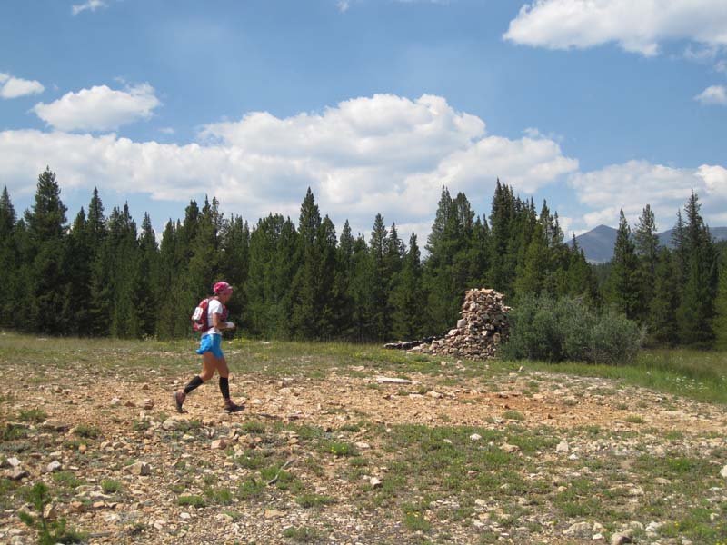 IMG_3832I managed hydration and nutrition fairly well, but the continual climb eventually got to my psyche. So much that when it finally flattened out, I could hardly run. It was the only time I tripped and nearly fell, which made me even more angry. Reaching the aid station at about mile 14, you leave most of the climbing behind and begin a steady descent. It’s over 11k feet there and you cross the continental divide. It was a great, run-able portion of the trail, but my legs (and lungs) would not cooperate. I ran some and walked some, but it was more walking. I was frustrated with myself. After crossing the highway, with about 6 miles left, we entered a nice forest trail.