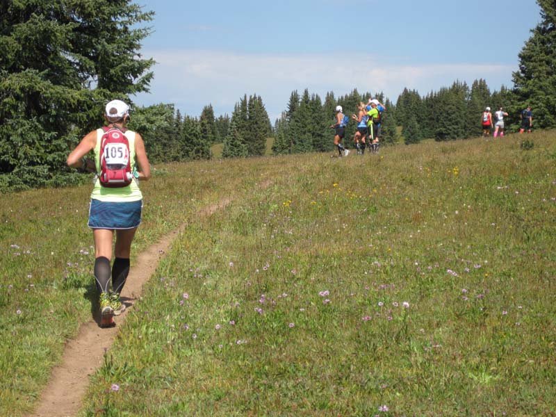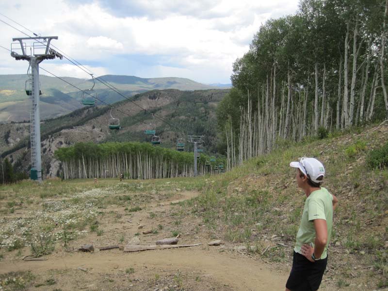 IMG_3904The road turned to single track and climbed even steeper. I motored right on up and we finally reached an opening with a wonderful view. The trail went up and down for a bit before we reached the back of the Vail ski area and climbed the switchbacks of one of its bowls. Although tiring, it was the most beautiful section of the whole week. The trail wound through wildflowers of all colors while Rockies stood watching in the distance. You could see the train of racers marching up the switchback trail.
