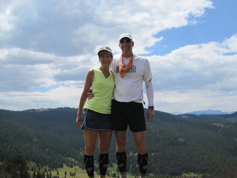 IMG_3859As you crest, you traverse a bowl and then a ridge for a few miles, continually taking in the amazing views. I met Silas, another racer’s partner who had never done more than a half marathon before. As I flew down the hill with him and his partner, he said, “You are amazing!” His partner said, “Who? Me?” And Silas told him, “No! Her!!”  Made me smile as I bounded down the hill. Reaching the creek crossing, I waited only briefly for Gary and we trudged through the water. The trail goes about 1/4 mile directly through the creek which felt good at first, until my feet started going numb. Again, Gary pushed me to the finish. I was finally figuring out his M.O. Push me hard to finish, then apologize later for doing so.