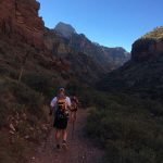 We started just after sunrise, about 7am. It really wasn’t cold and we had a nice jog down the first few miles. That is, until Karen took a spill and powdered her face and cut her hand. She was ok and we continued on. It was a pretty day and mostly uneventful down to Phantom Ranch where we stopped for a snack and drink.